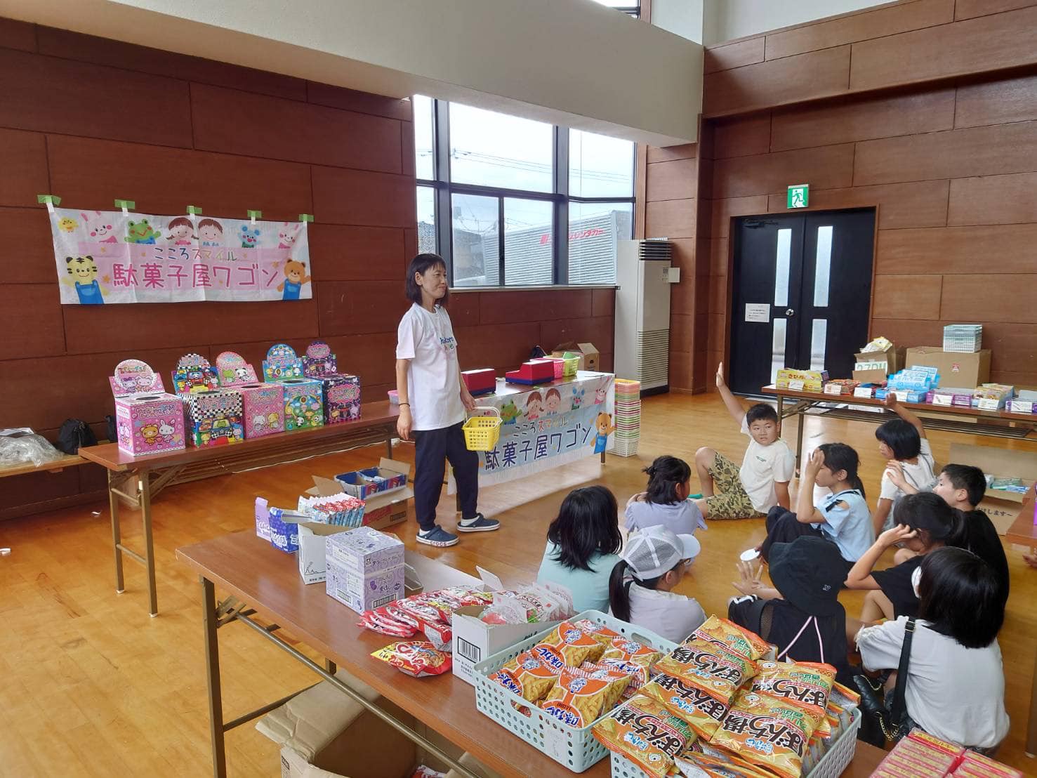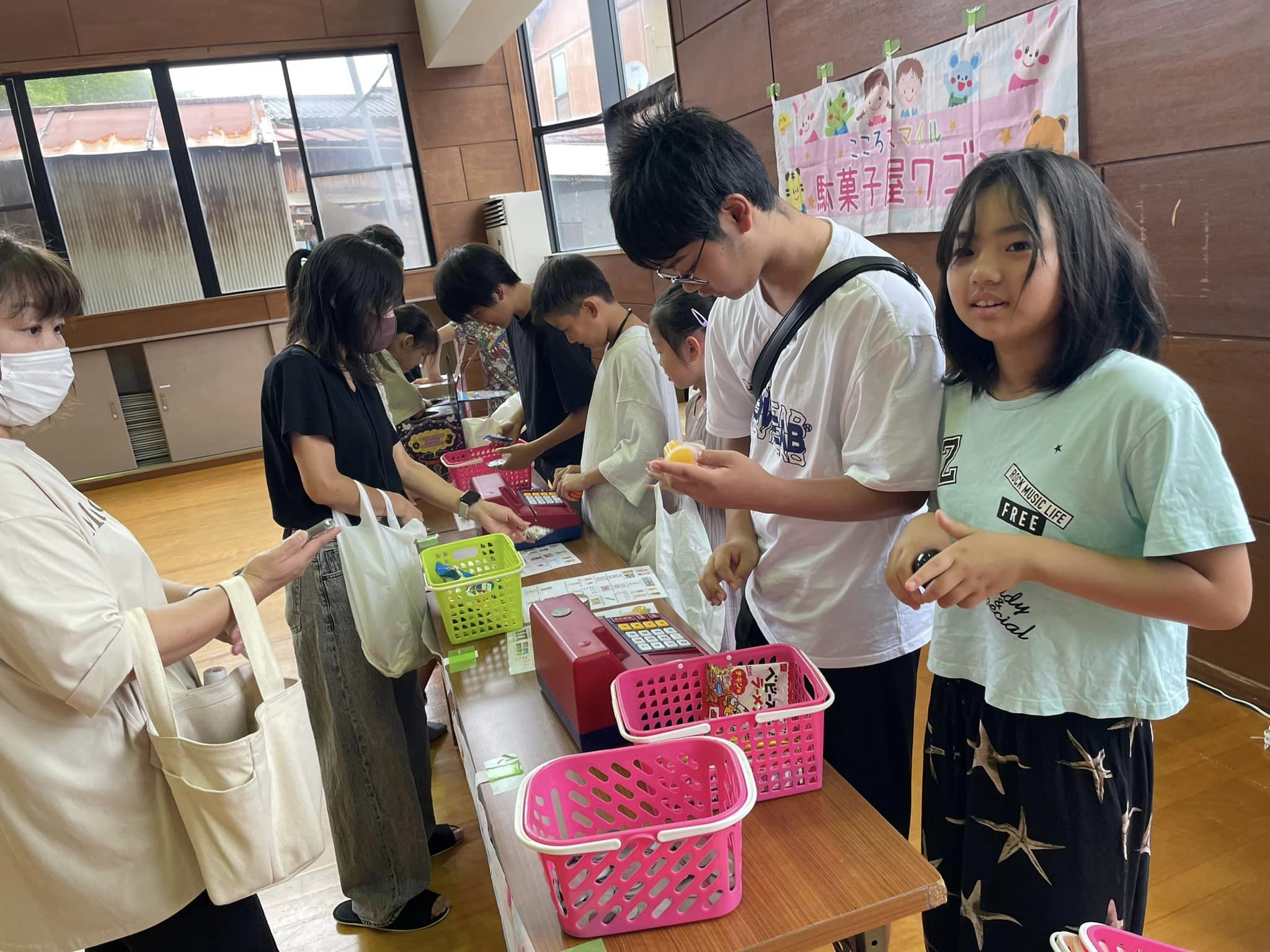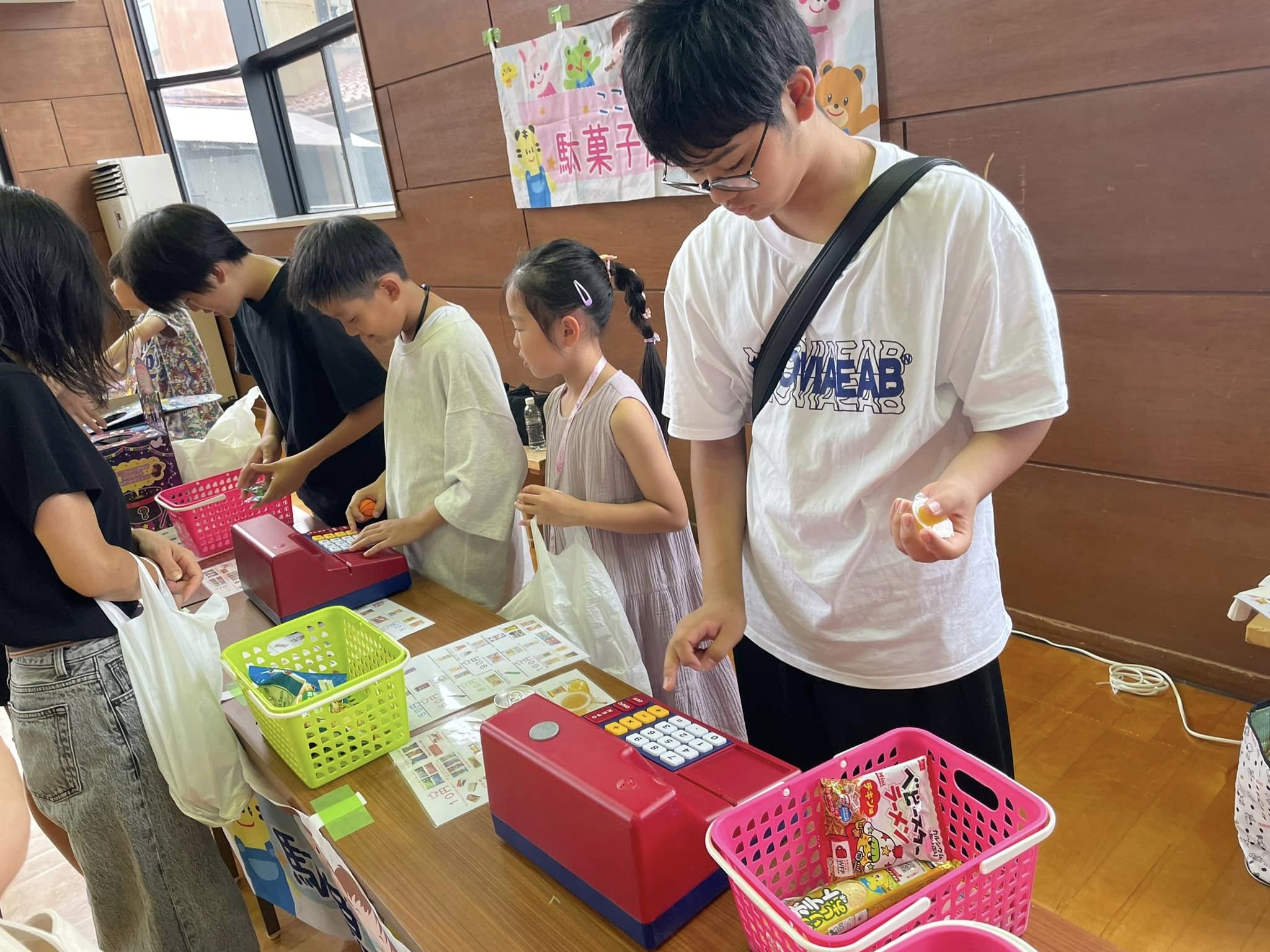 待ちきれず早く来た子どもたちが陳列を手伝ってくれ、早く買い物を済ませた子どもがレジを担当、次々とレジ希望の子どもが増え、友達同士協力しながら懸命に会計していました😄公民館でそろばんを教えている教室の先生も陳列からレジまで積極的にご協力くださいました❗️