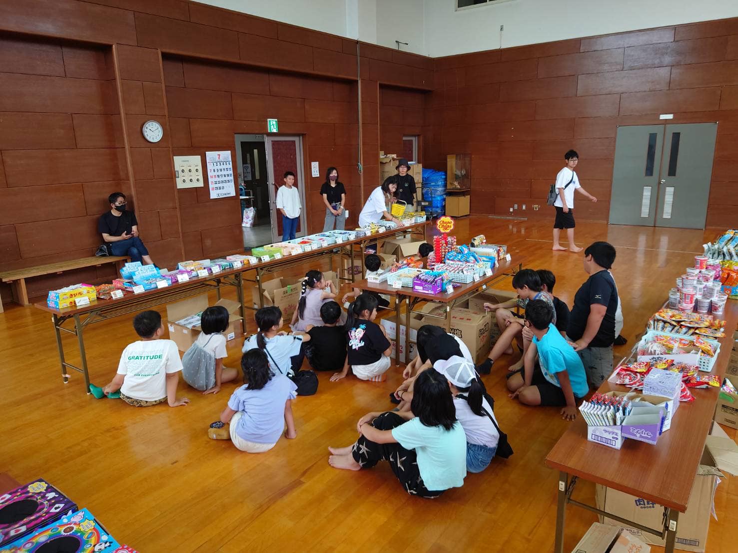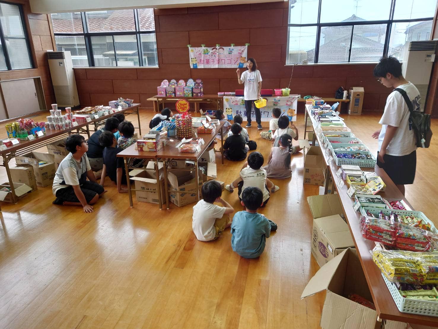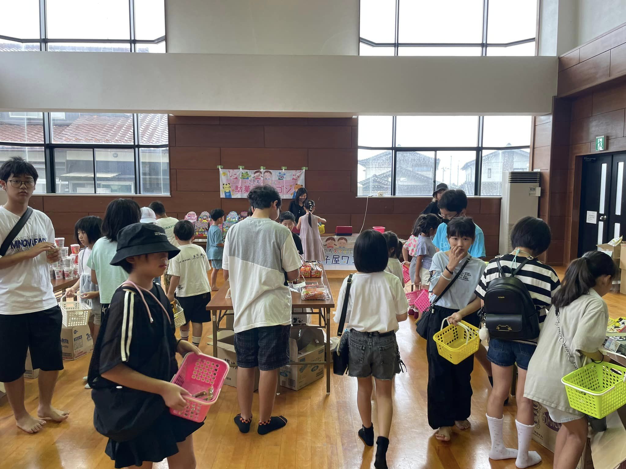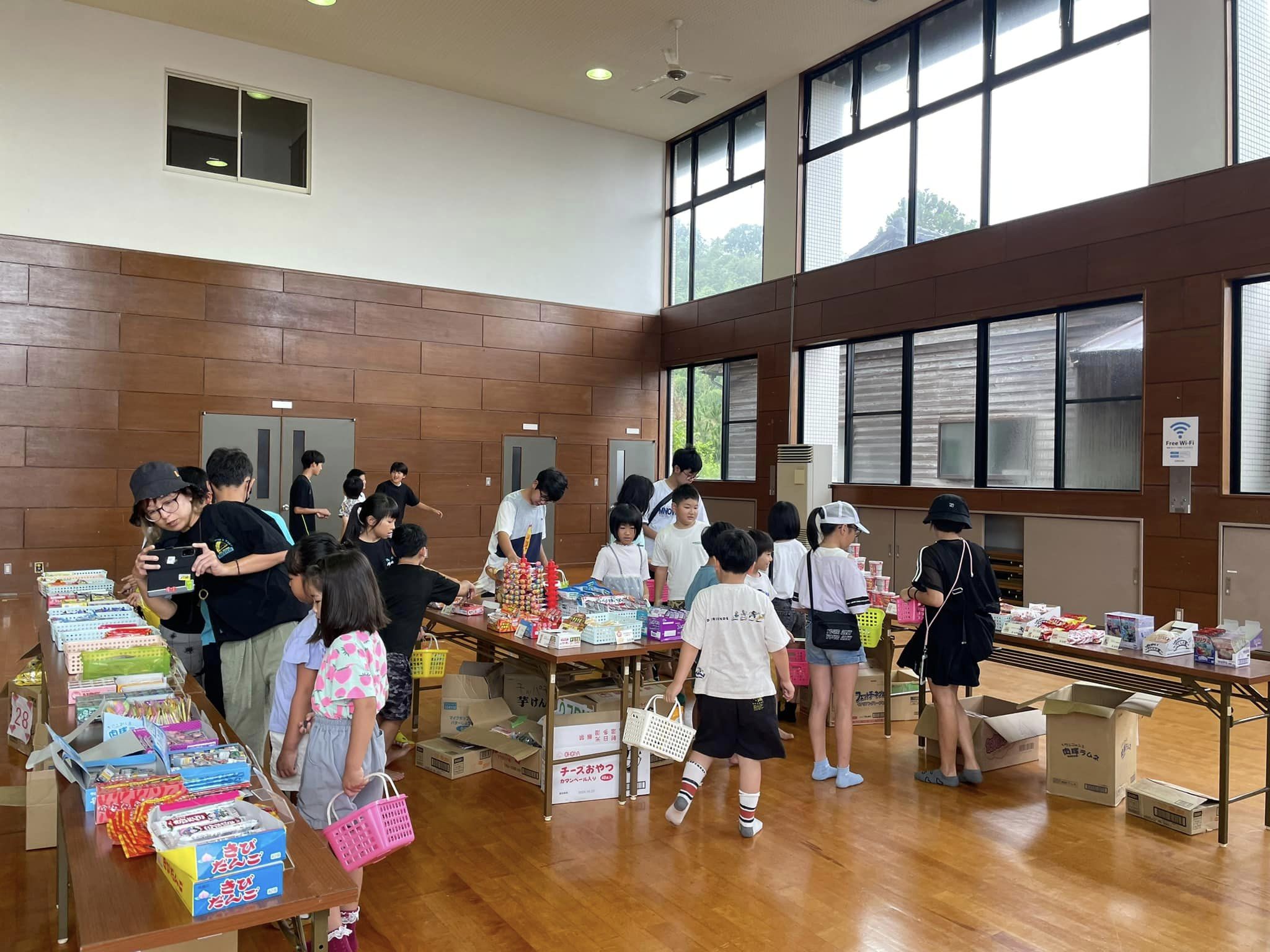 待ちきれず早く来た子どもたちが陳列を手伝ってくれ、早く買い物を済ませた子どもがレジを担当、次々とレジ希望の子どもが増え、友達同士協力しながら懸命に会計していました😄公民館でそろばんを教えている教室の先生も陳列からレジまで積極的にご協力くださいました❗️