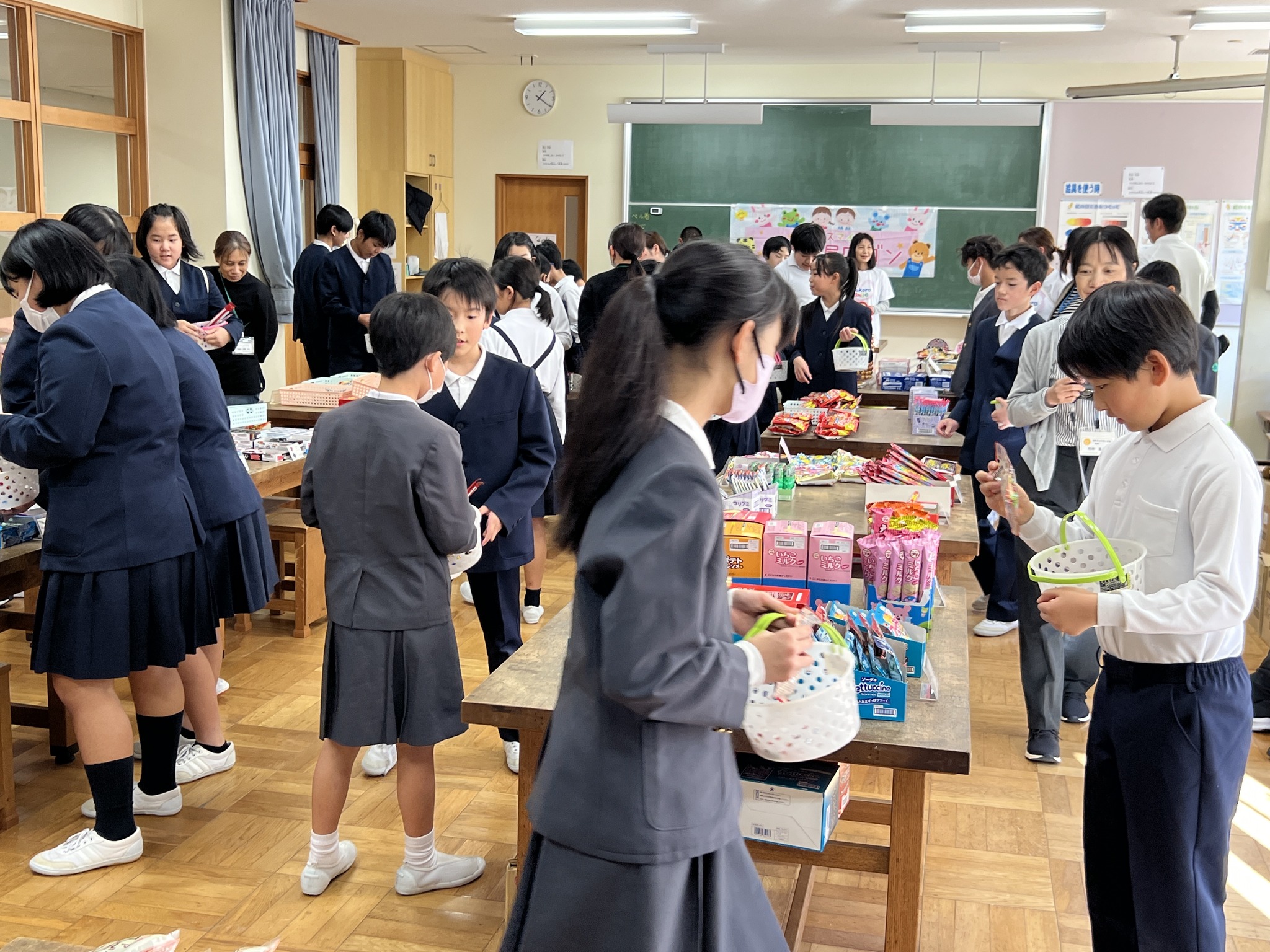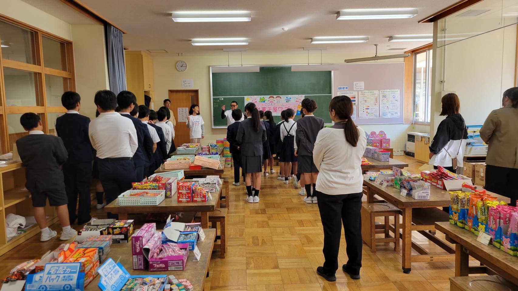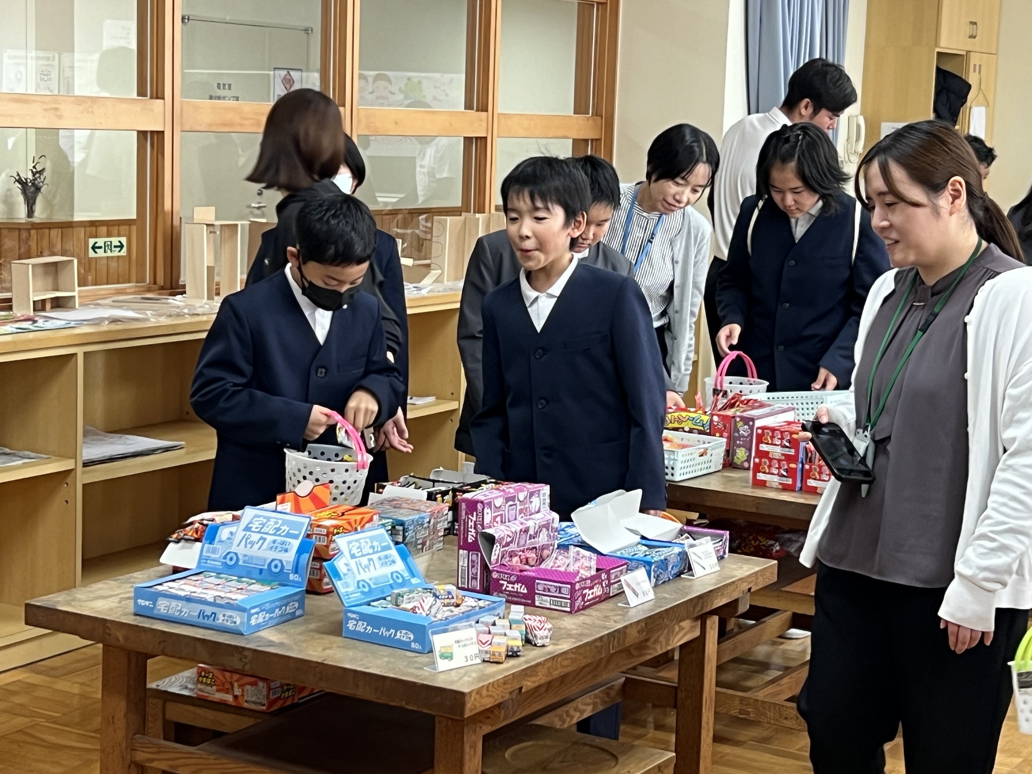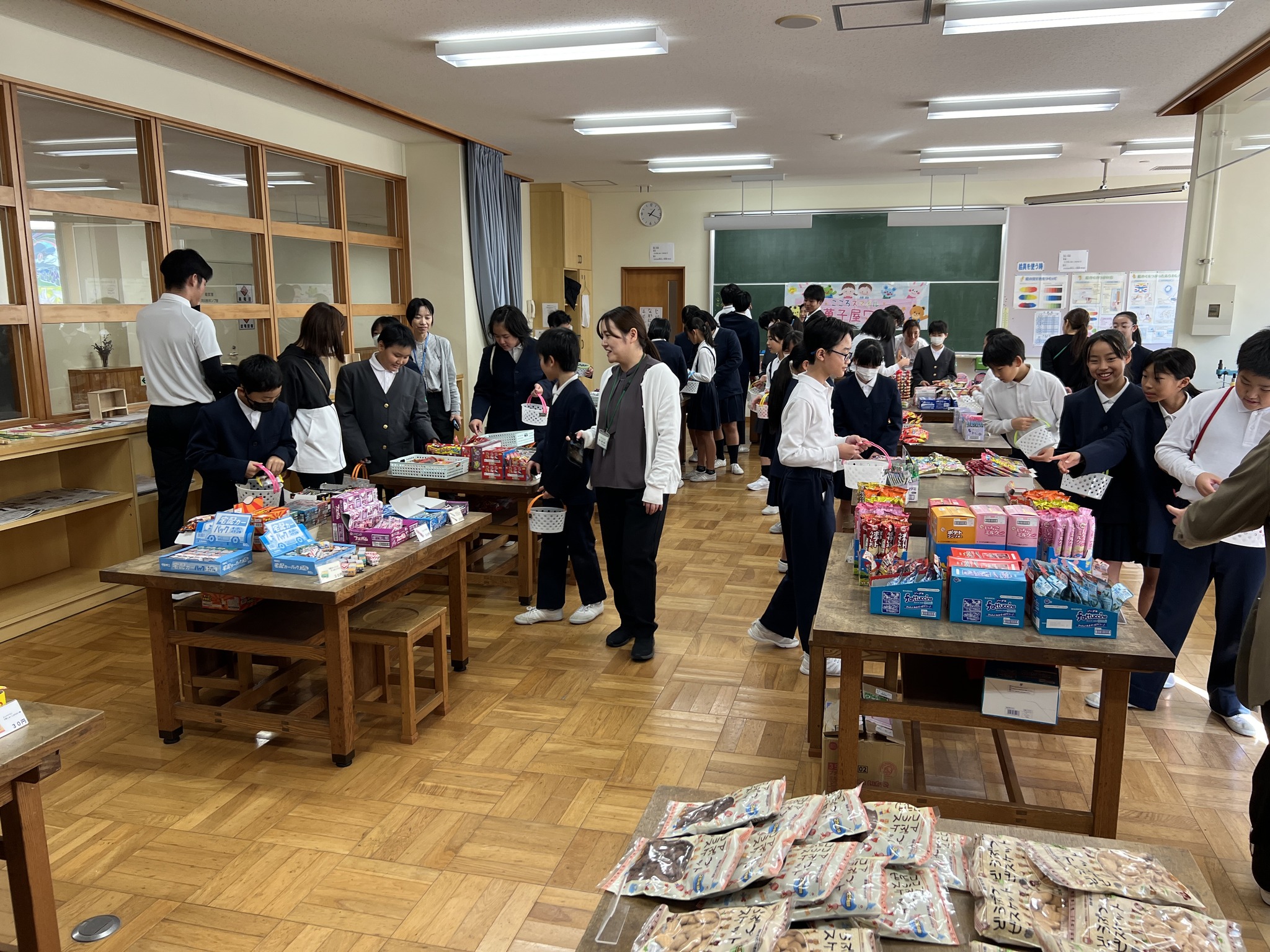 楽しそうにお友達と駄菓子を選ぶ子どもたち。一生懸命暗算で計算する子ども。早く買い物が終わった児童へ「ボランティアでレジを手伝って」と声をかけると、次々と「手伝います!」とレジや袋詰めを手伝ってくれました。全児童の買い物が終わり、次は先生方の買い物タイム