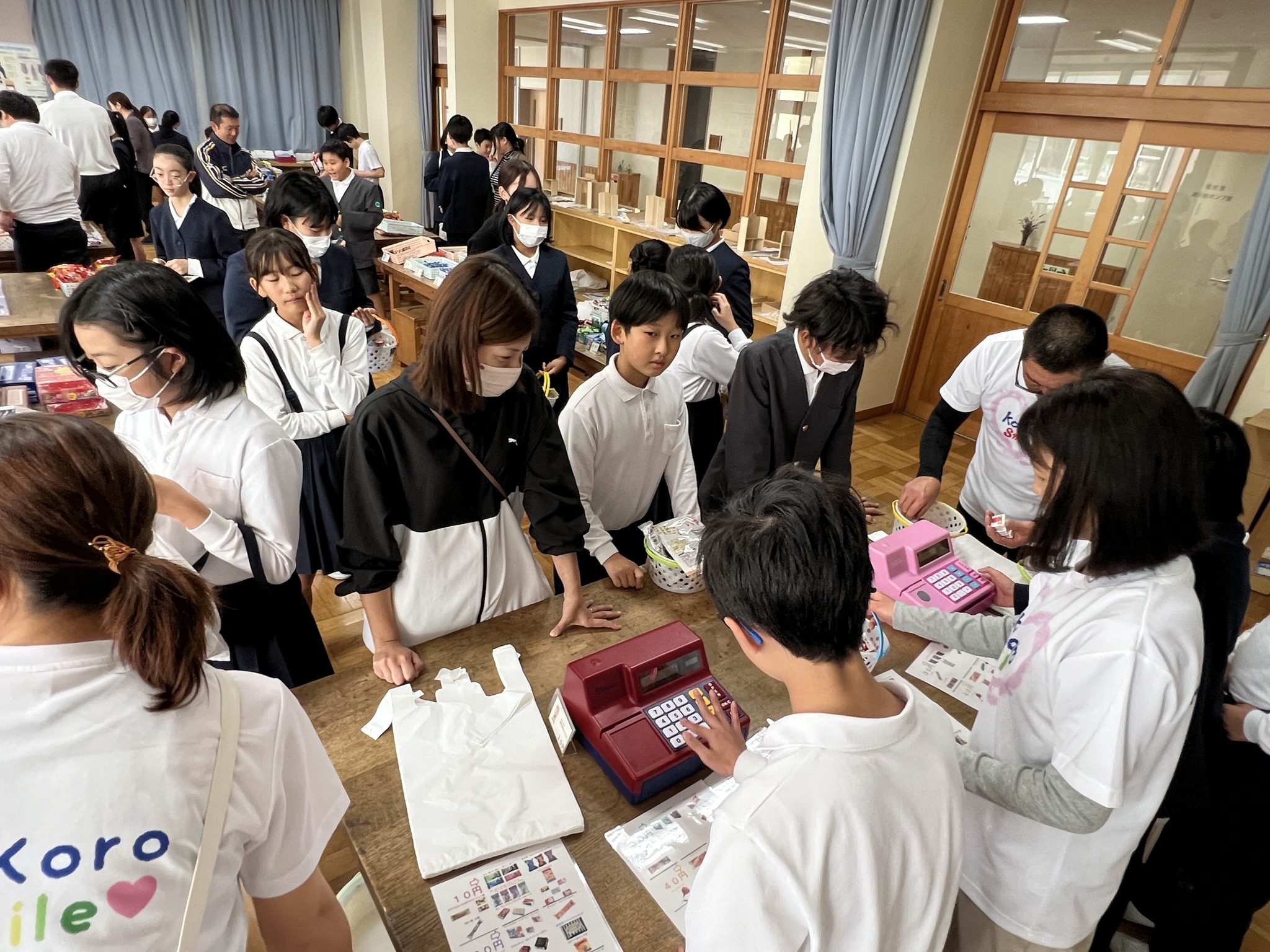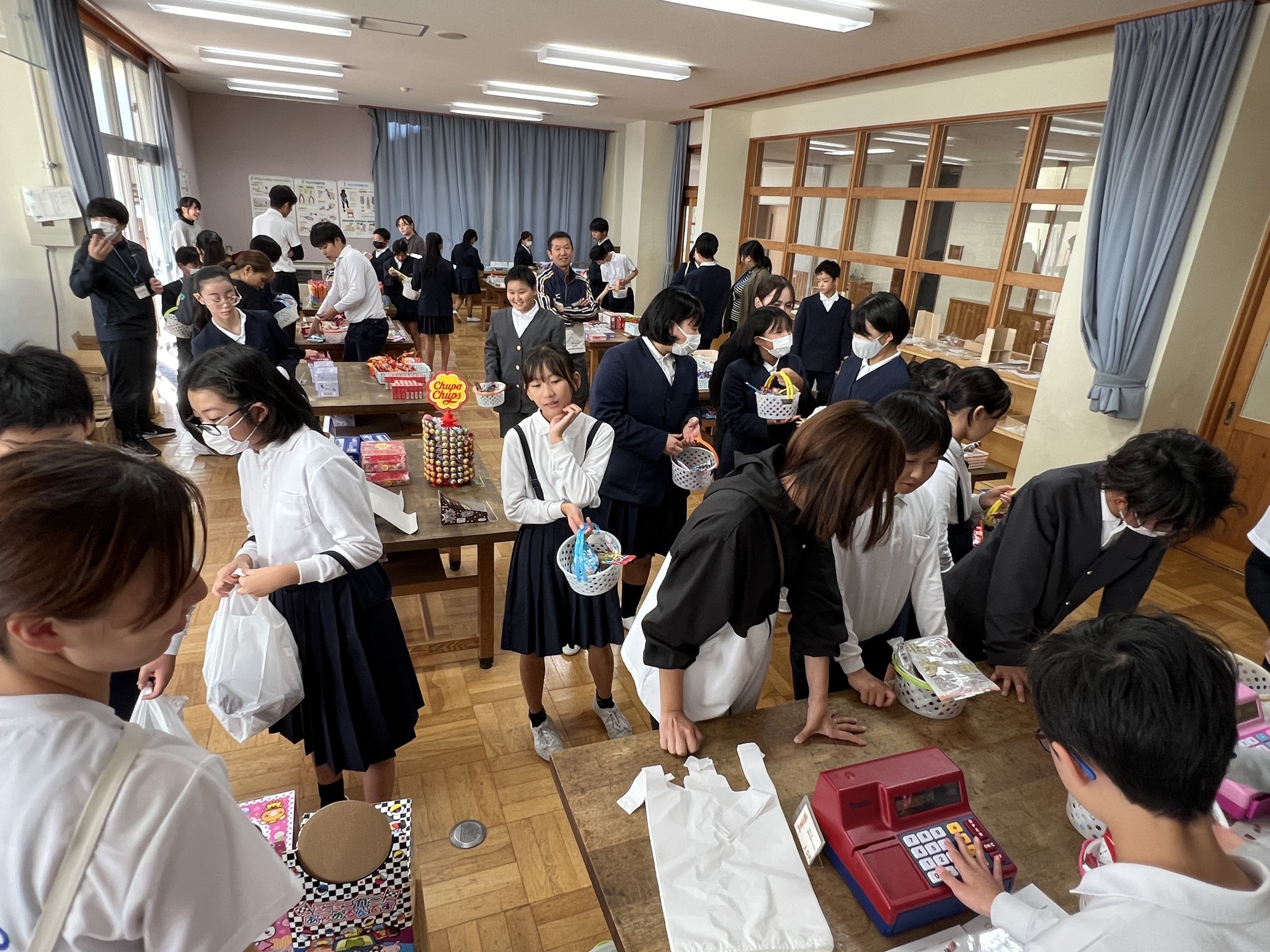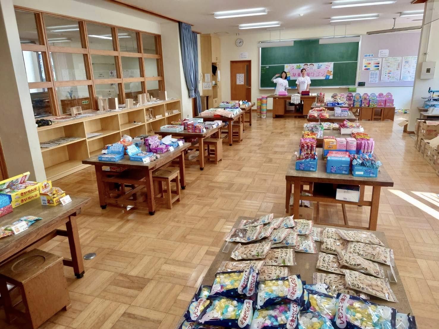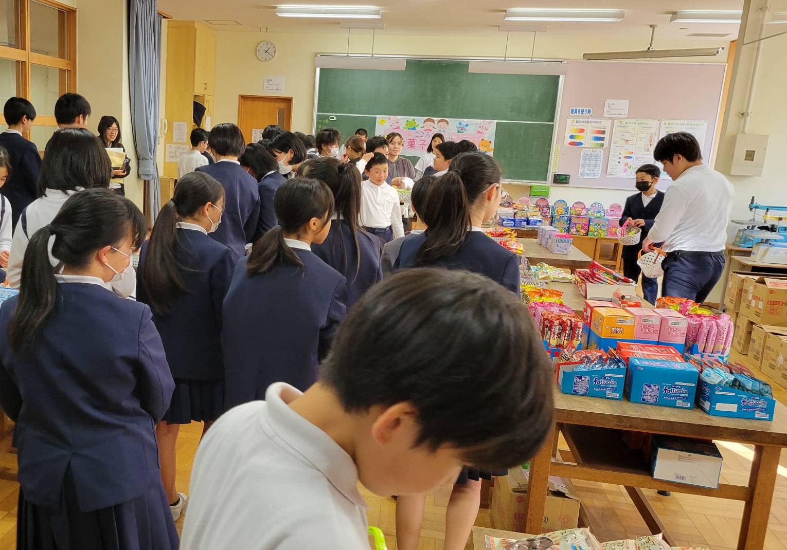 楽しそうにお友達と駄菓子を選ぶ子どもたち。一生懸命暗算で計算する子ども。早く買い物が終わった児童へ「ボランティアでレジを手伝って」と声をかけると、次々と「手伝います!」とレジや袋詰めを手伝ってくれました。全児童の買い物が終わり、次は先生方の買い物タイム